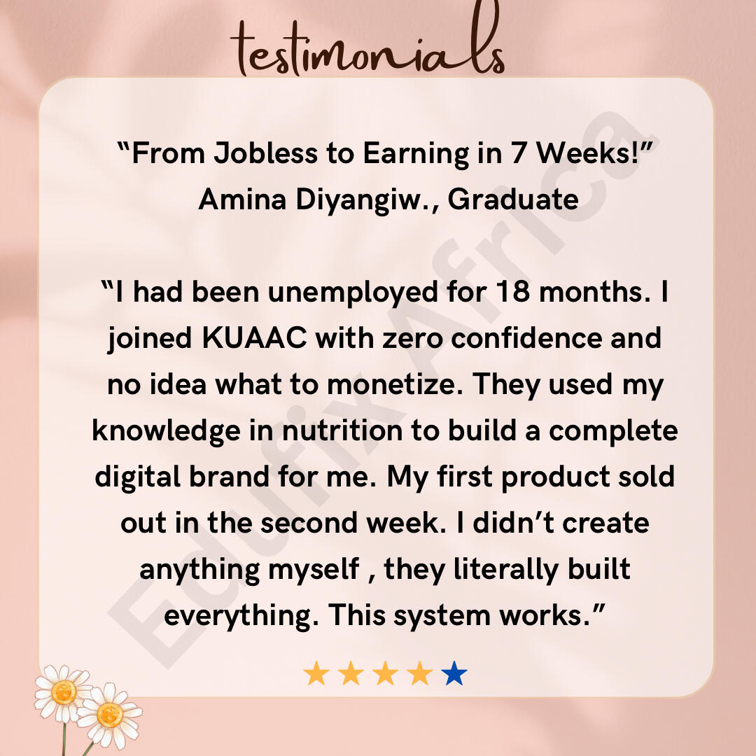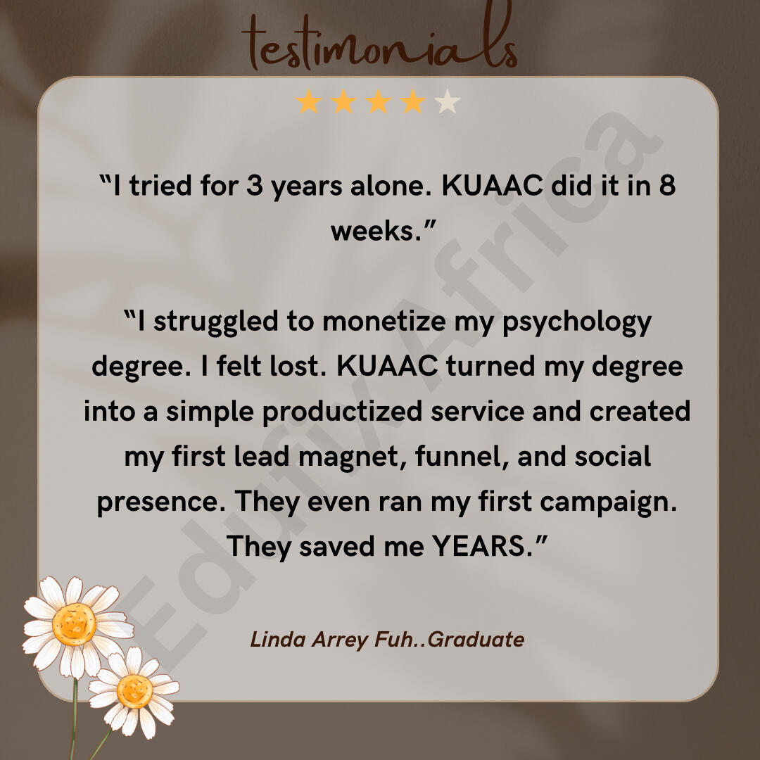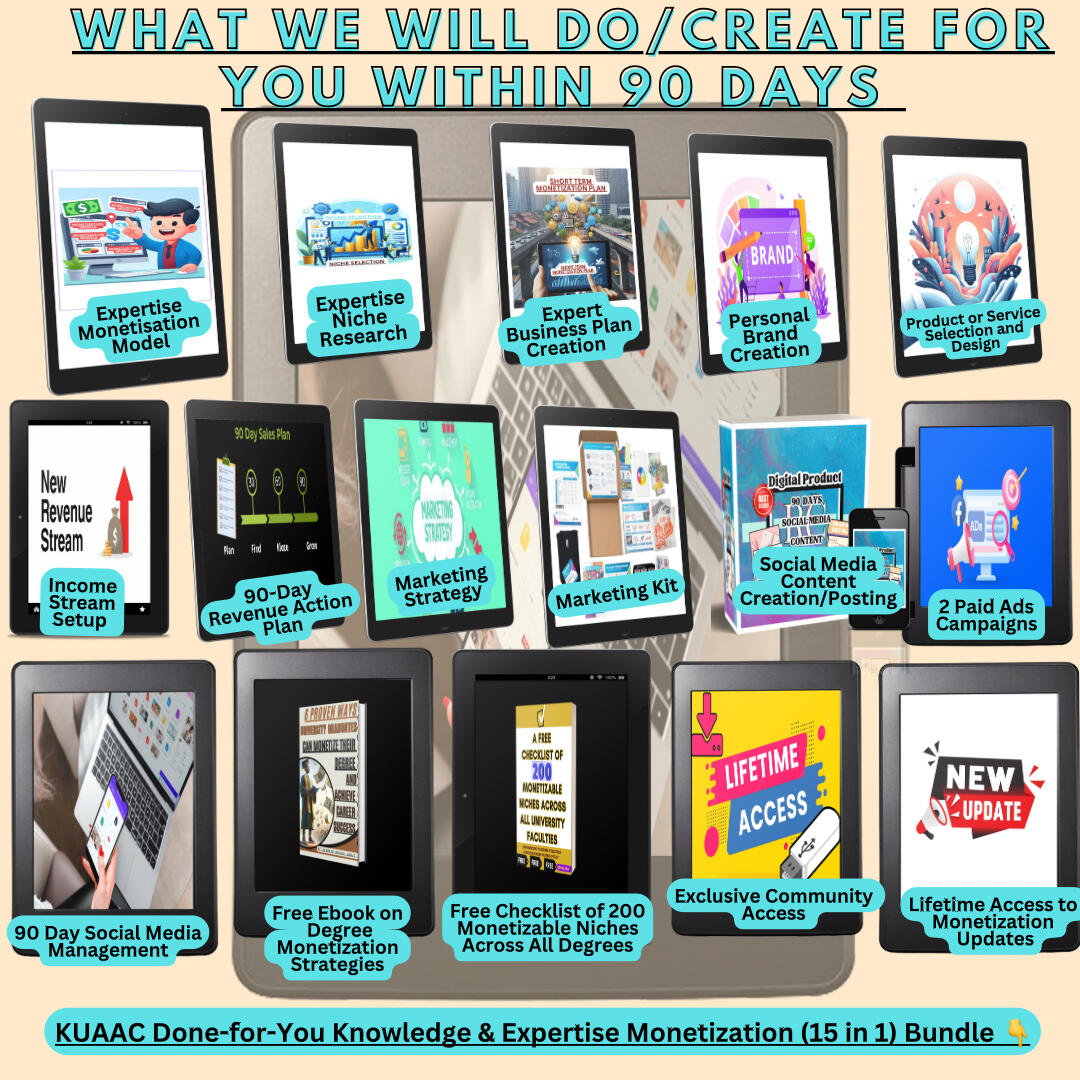 • Graduates: We will use the KUAAC framework to turn your hard-earned degree into real income.• Professionals: We will use the KUAAC framework to monetize your expertise without quitting your job.• Retirees: We will use the KUAAC framework to transform decades of experience into a lasting legacy and steady profit.• Unemployed Graduates: We will use the KUAAC framework to build income streams from your education, no prior experience needed.• Career Changers: We will use the KUAAC framework to shift smoothly into a profitable new direction.• Aspiring Entrepreneurs: We will use the KUAAC framework to develop, brand, and launch your business idea for you.We understand you don’t have the time, and trial-and-error often ends in failure.That’s why with KUAAC Done-for-You, we don’t just teach you how to monetize your skills and knowledge, we implement it all for you, from identifying opportunities to launching income-generating projects.
