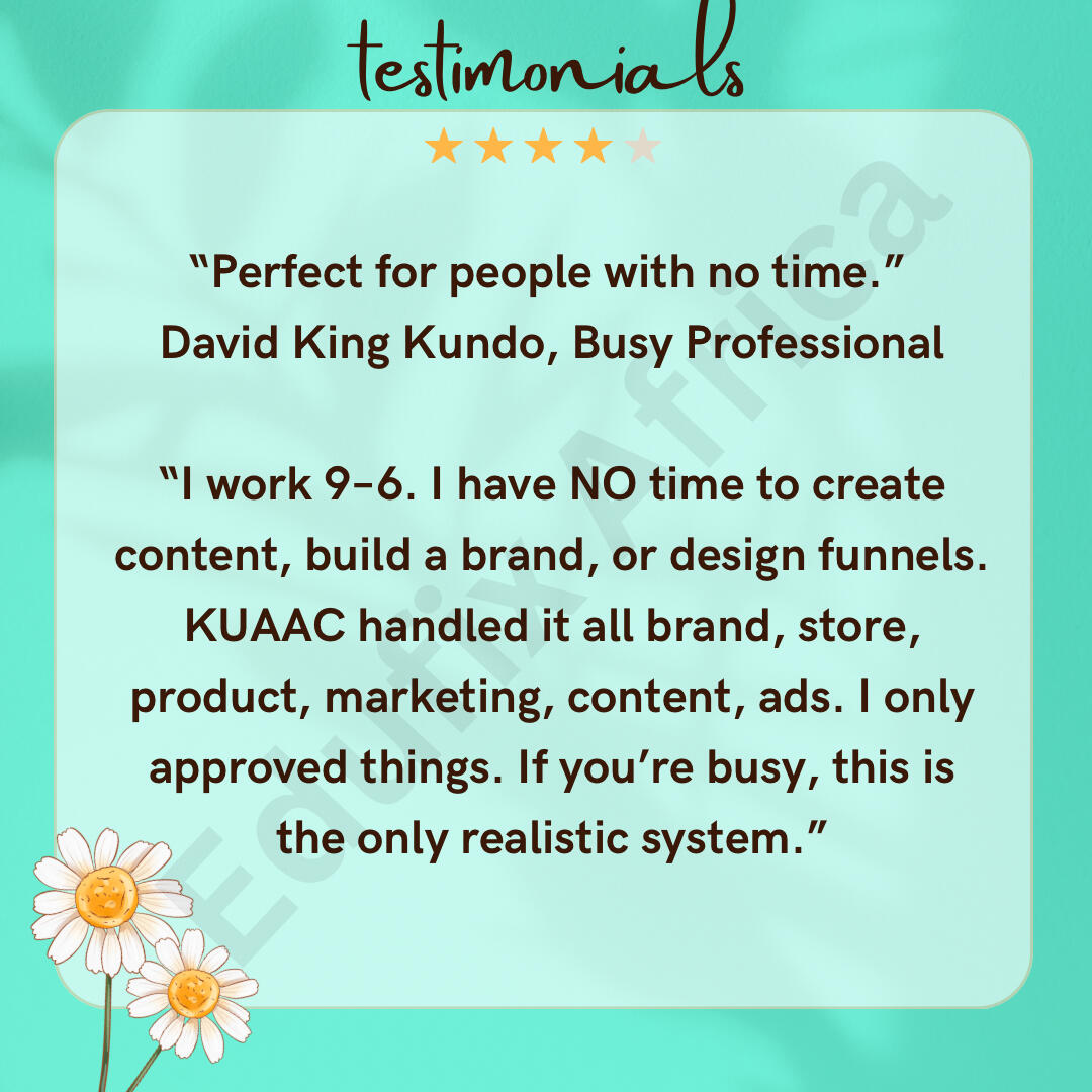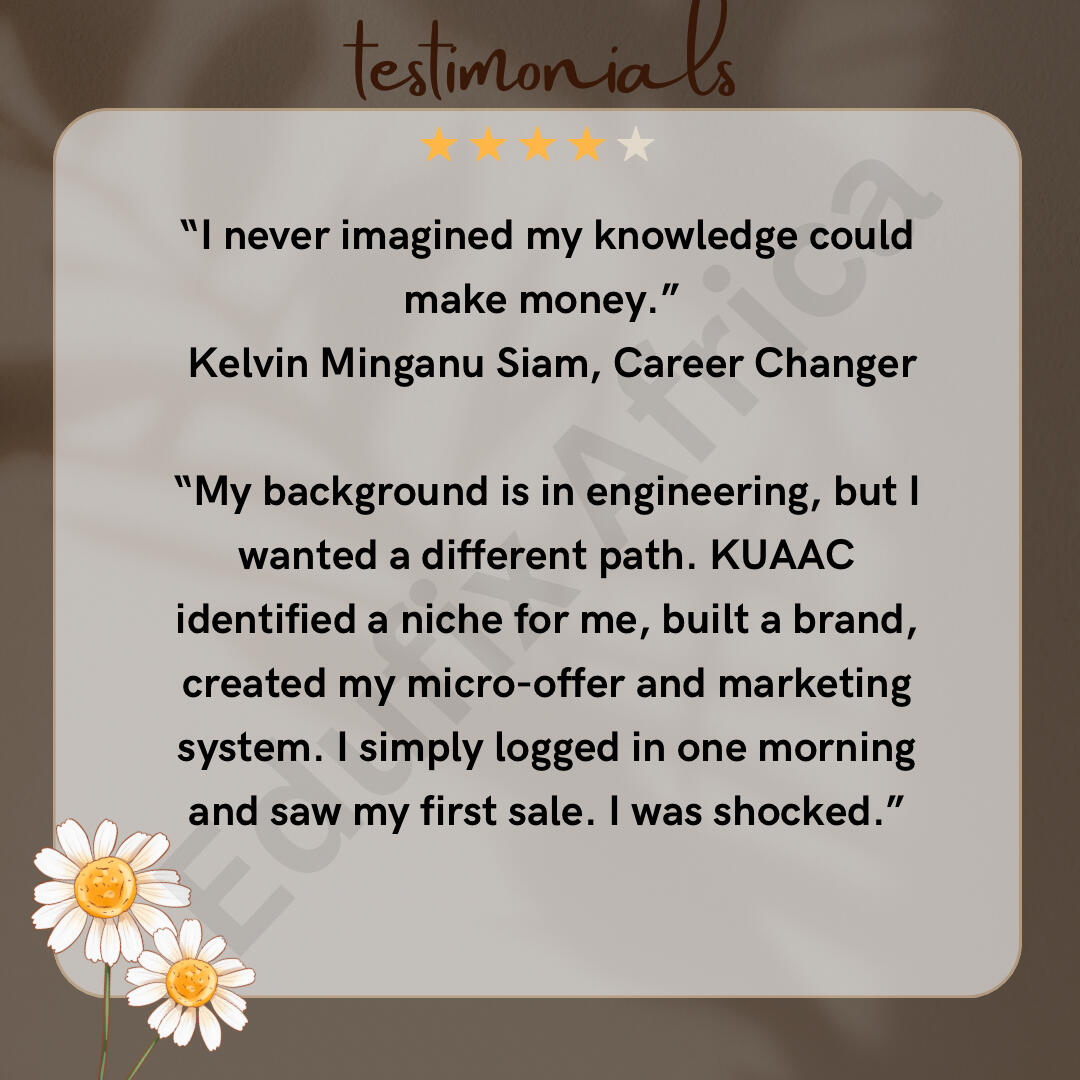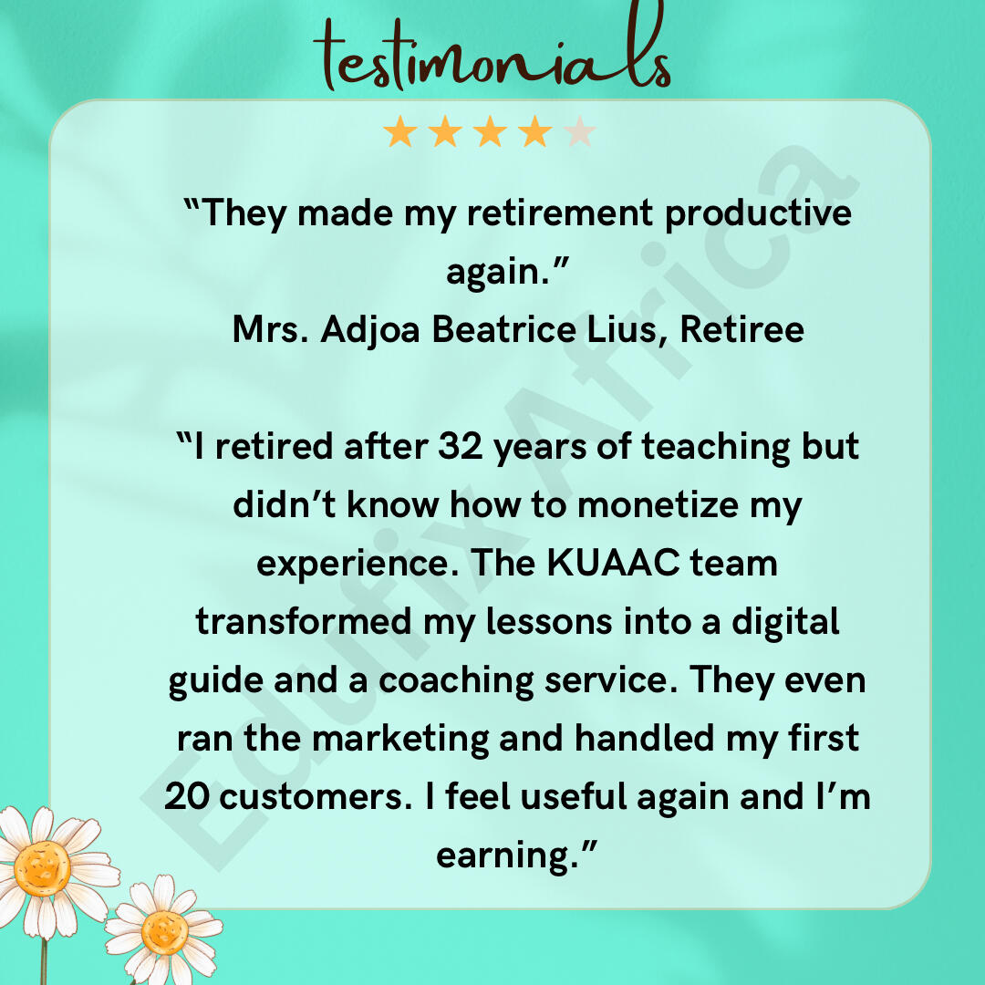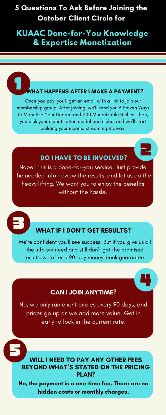 • Graduates: We will use the KUAAC framework to turn your hard-earned degree into real income.• Professionals: We will use the KUAAC framework to monetize your expertise without quitting your job.• Retirees: We will use the KUAAC framework to transform decades of experience into a lasting legacy and steady profit.• Unemployed Graduates: We will use the KUAAC framework to build income streams from your education, no prior experience needed.• Career Changers: We will use the KUAAC framework to shift smoothly into a profitable new direction.• Aspiring Entrepreneurs: We will use the KUAAC framework to develop, brand, and launch your business idea for you.We understand you don’t have the time, and trial-and-error often ends in failure.That’s why with KUAAC Done-for-You, we don’t just teach you how to monetize your skills and knowledge, we implement it all for you, from identifying opportunities to launching income-generating projects.