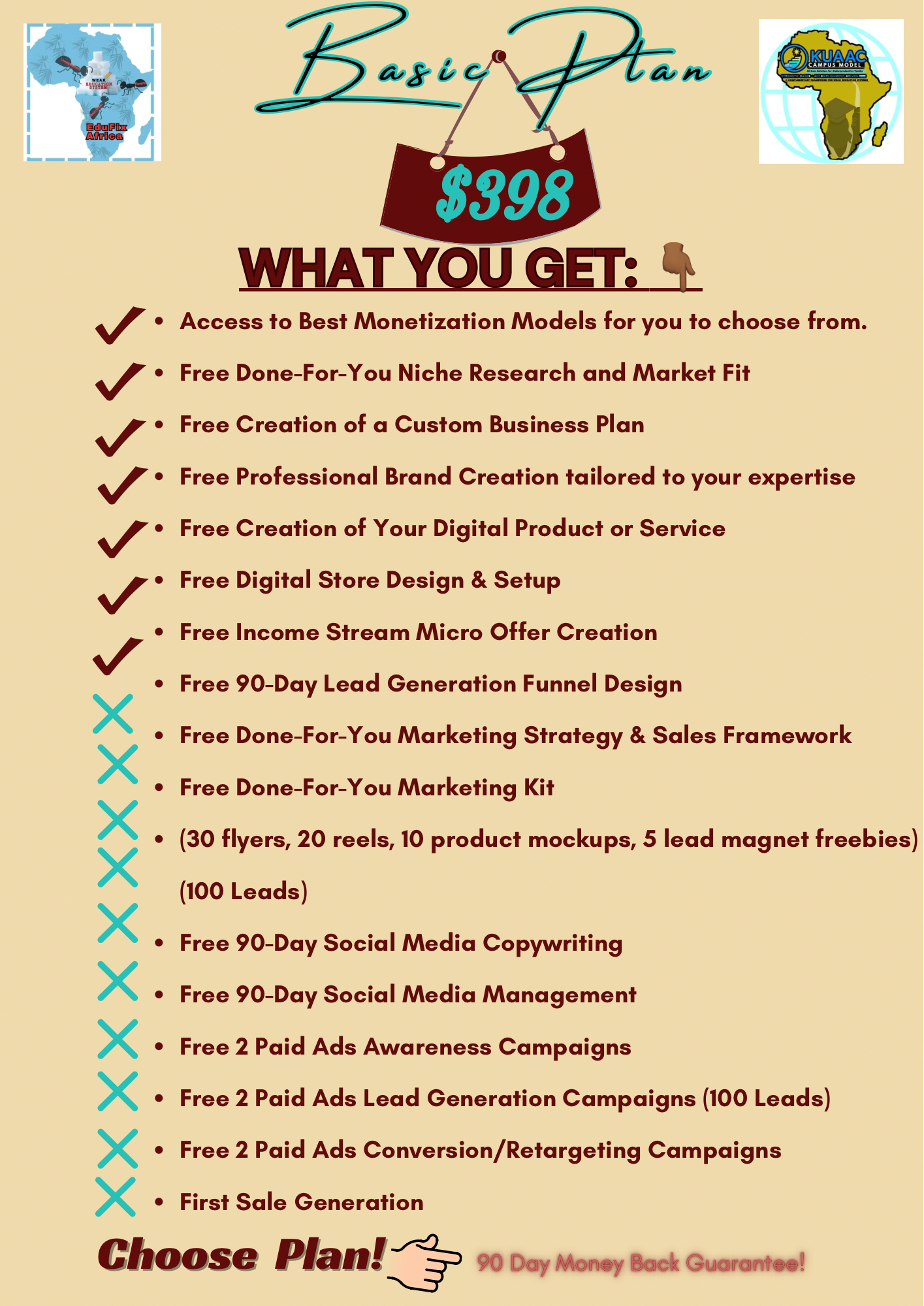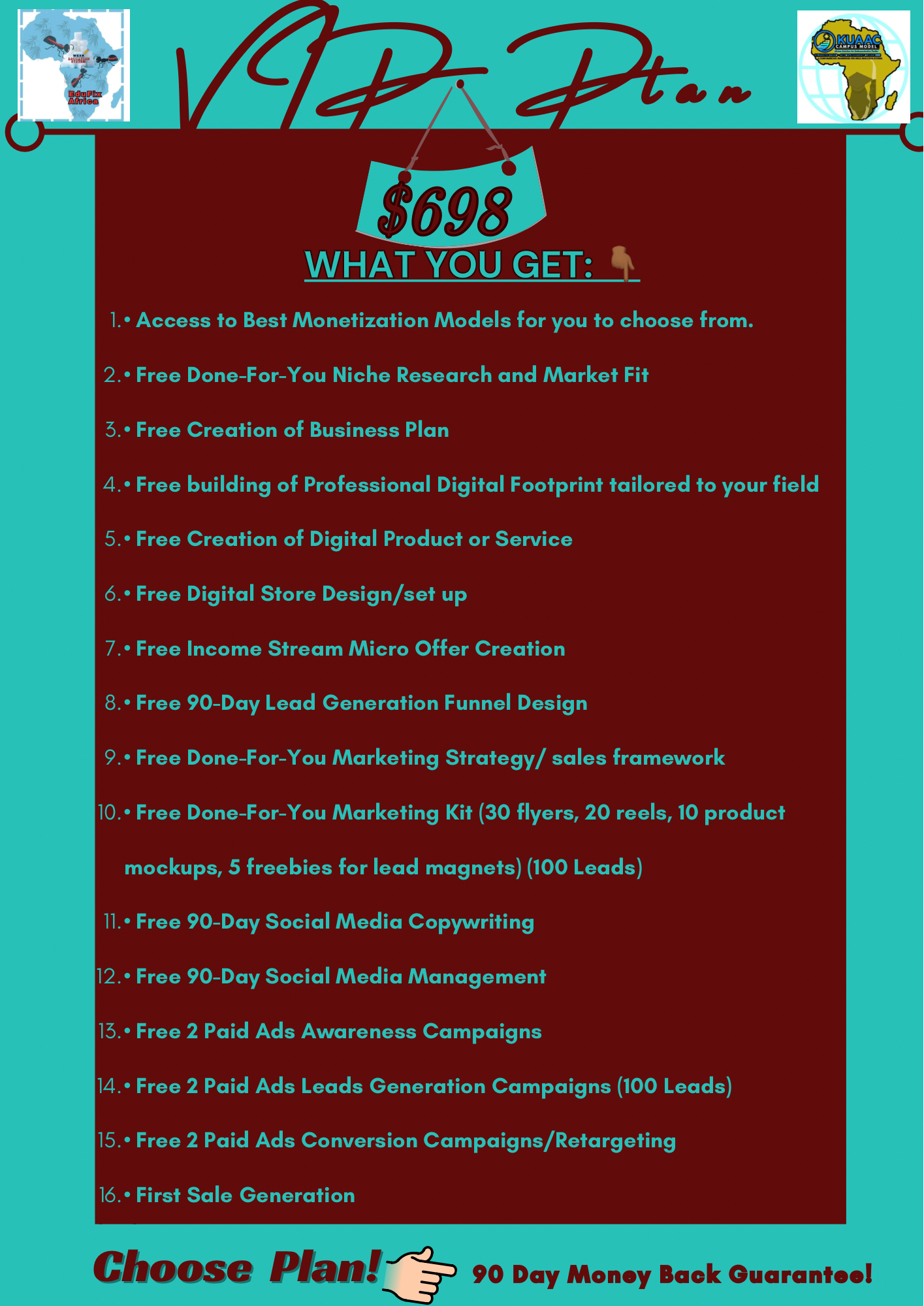 What You Get in the VIP Plan:You will have a thriving income stream that generates consistent leads, converts customers, and delivers ongoing sales. Your business will be strategically positioned for growth, with a clear path to financial freedom.1. We will start by Identifying a market-fit niche based on your expertise, skills, background, or experience.2. Craft a detailed business plan to scale your income stream.3. Design a professional logo and a highly functional website.4. Create your digital product or service from start to finish.5. Set up and launch your income stream digital store with a seamless payment system.6. Package your product or service into a 6-in-1 irresistible micro offer. Design a high-converting lead generation funnel to attract potential customers.7. Create a unique marketing strategy and sales framework to ensure your product reaches the right audience.8. Provide a marketing kit, including 30 flyers, 20 reels, 10 product mockups, and 5 lead magnet freebies.9. Manage your social media account for 90 days, posting daily to grow your audience.10. Create text copies for 90 days to ensure consistent content creation for your brand.11. Run 2 paid Facebook ads to generate awareness and attract 100 followers interested in your product or service.12. Launch 2 additional paid ads promoting your micro offer to drive sales.13. Run 2 retargeting ads to engage previous visitors and increase conversions.14. Provide scaling strategies to grow your income stream and show you how to replicate the process for ongoing financial growth.