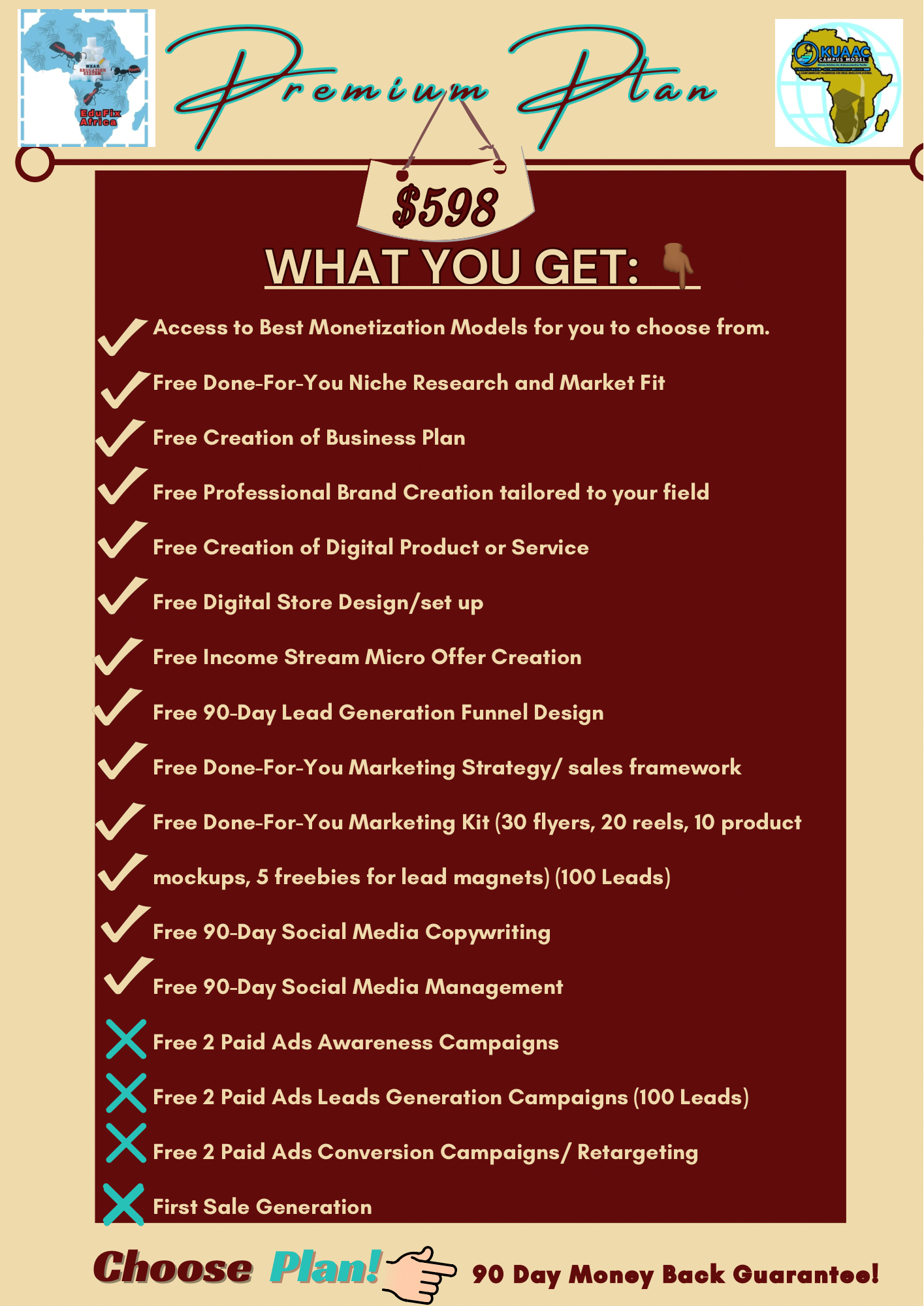 What You Get in the Premium Plan:You will have a fully functioning income stream, a strong marketing strategy, and a professional online presence that generates leads and sales.1. Identify a profitable niche aligned with your expertise.2. Craft a detailed business plan to scale your income stream.3. Design a professional brand, including logo and a high-performance website.4. Create your digital product or service from start to finish.5. Set up and launch your income stream + digital store + seamless payment system.6. Package your offer into a 6-in-1 irresistible micro offer +