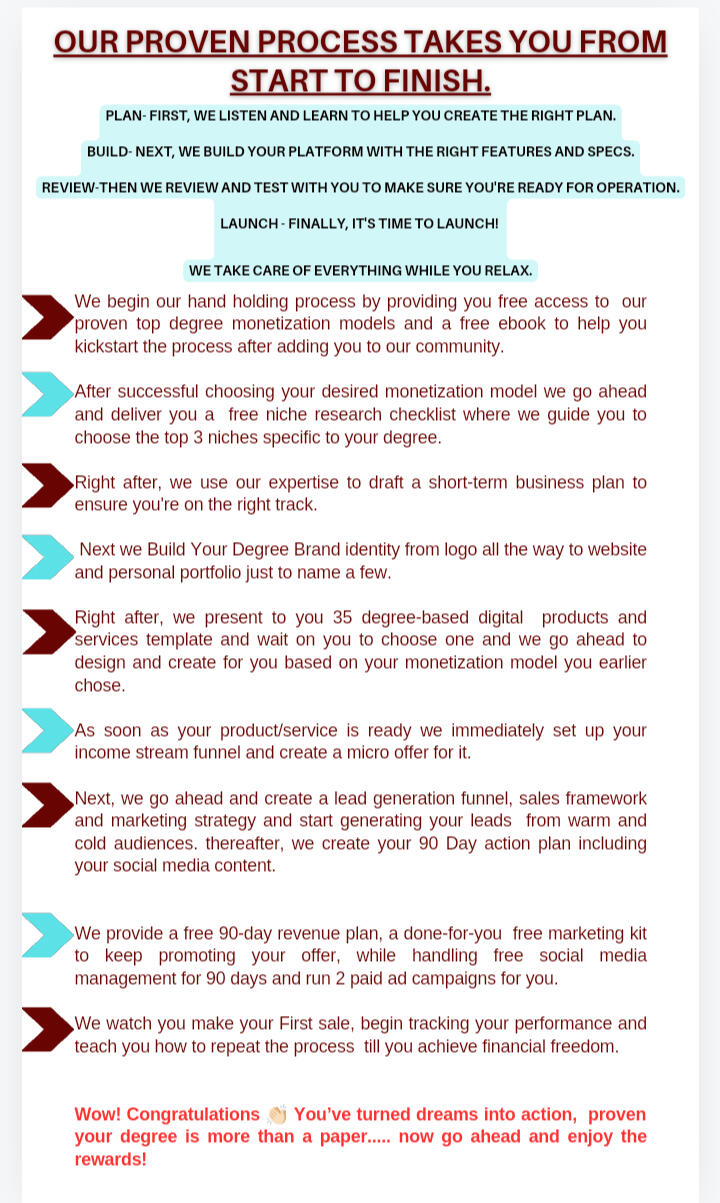 Remember: This is not a training program but a done-for-you service. We handle everything, from niche identification to brand creation, product/service design, marketing setup, content creation, and sales generation, ensuring you get a fully functioning income stream based on your expertise (degree, skills, talents, passions, hobbies, or experience) with tangible results within 90 days.